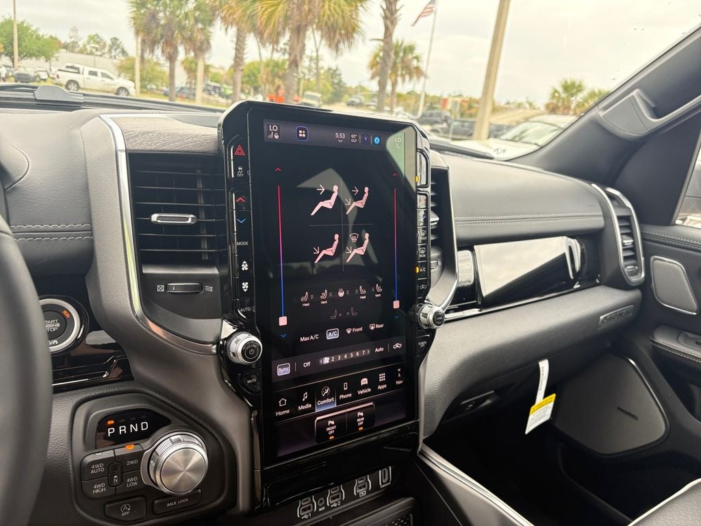 Advanced Safety Group II: Exterior Mirrors Approach Lamps; Active Driving Assist System; Surround View Camera System; Evasive Steer Assist; Drowsy Driver Detection; Intersection Collision Assist System; Traffic Sign Recognition; 12-Way/1-way Trailer Connector. Quick Order Package 27H Laramie. Laramie Level 2 Equipment Group: SiriusXM Radio Service; USB Host Flip; Rain Sensitive Windshield Wipers; 14.4" Touchscreen Display; Integrated Center Stack Radio; Front Passenger Interactive Display; Integrated Voice Command with Bluetooth®; Connectivity - US/Canada; Uconnect 5 Nav with 14.4" Display; GPS Navigation; 4G LTE Wi-Fi Hot Spot; Harman/kardon 19 Speaker Premium Sound; SiriusXM with 360L; Connected Travel and Traffic Services; Cluster 12" TFT Color Display; Power Tailgate. Night Edition: Black Headlamp Bezels; Auto Power-Folding Mirrors; 22" X 9" Forged Aluminum Wheels; Exterior Mirrors with Heating Element; Proximity Approach/departure Lamps; Auto Dim Exterior Driver Mirror; Accent Color Door Handles; Black Interior Accents; Body Color Front Bumper; Grille Surround 3 Black Texture 2 Black; Body Color Rear Bumper with Step Pads; RAM Grille Badge - Black; Black Painted Exterior Mirrors Caps; Exterior Mirrors Approach Lamps; Accent Color Premium Power Mirrors; Exterior Mirrors with Supplemental Signals; Sport Performance Hood; Exterior Mirrors Courtesy Lamps; Black Exterior Truck Badging; Accent Color Tailgate Handle; Exterior Mirrors with Memory; Dual Exhaust with Black Tips; Convex Wide-Angle Exterior Mirror Insert; Black Tail Lamp Bezels. Technology Group: Head Up Display; LED CHMSL Lamp; Digital Rearview Mirror; 12-Way/1-way Trailer Connector. Bed Utility Group: MOPAR Spray in Bedliner; Truck Bed Cargo Divider; MOPAR Deployable Bed Step; MOPAR 4 Adjustable Cargo Tie-Down Hooks; Exterior 115V AC Outlet. 22" X 9" Forged Aluminum Wheels. Dual-Pane Panoramic Sunroof. Power Deployable Running Boards. RamBox Cargo Management System. Ivory White Tri-Coat PC. E-Locker Rear Axle. 33 Gallon Fuel Tank. 3.92 Rear Axle Ratio. **Equipment listed is based on original vehicle build and subject to change. Please confirm the accuracy of the included equipment by calling the dealer prior to purchase.**